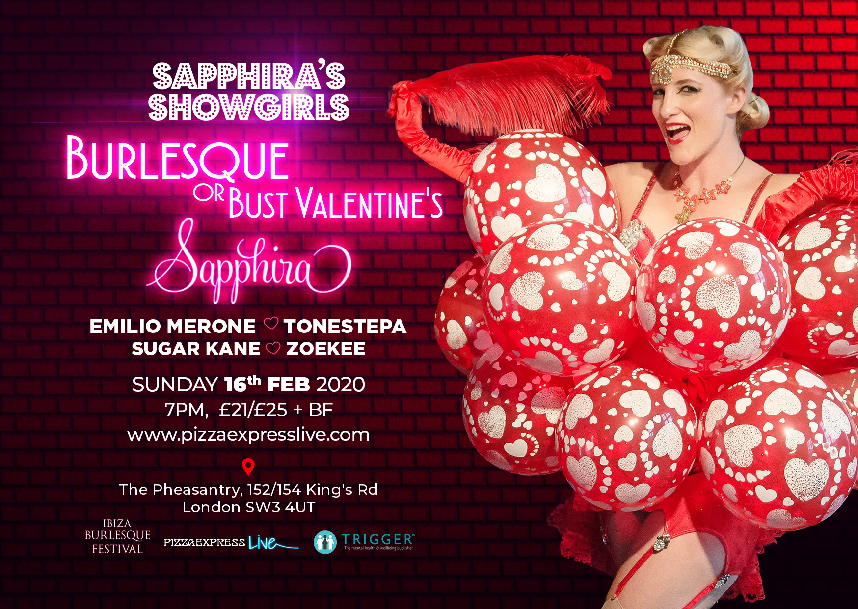Join the Ibiza Burlesque Festival co-producers, yours truly Sapphira & my partner in crime, Tonestepa for Valentine’s. We are putting on a fun soiree with jazz, poetry and burlesque at the gorgeous London cabaret venue, The Pheasantry.